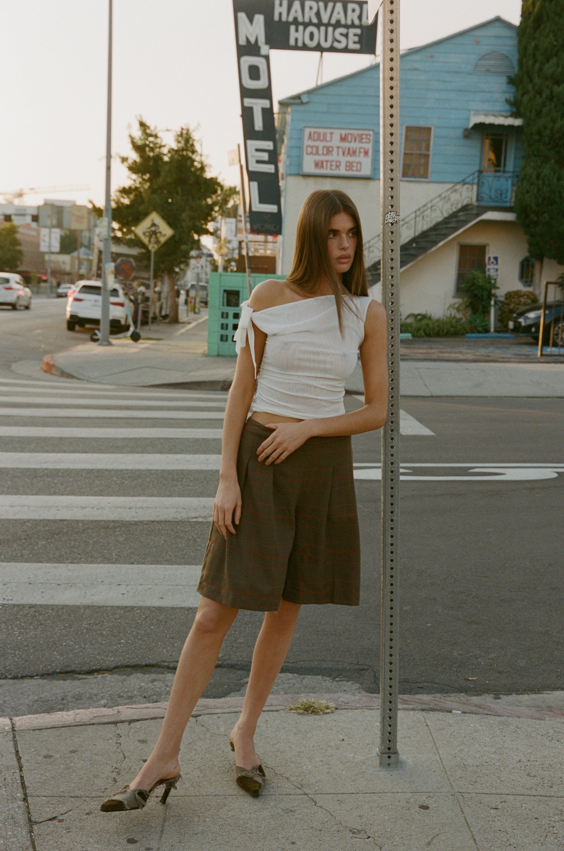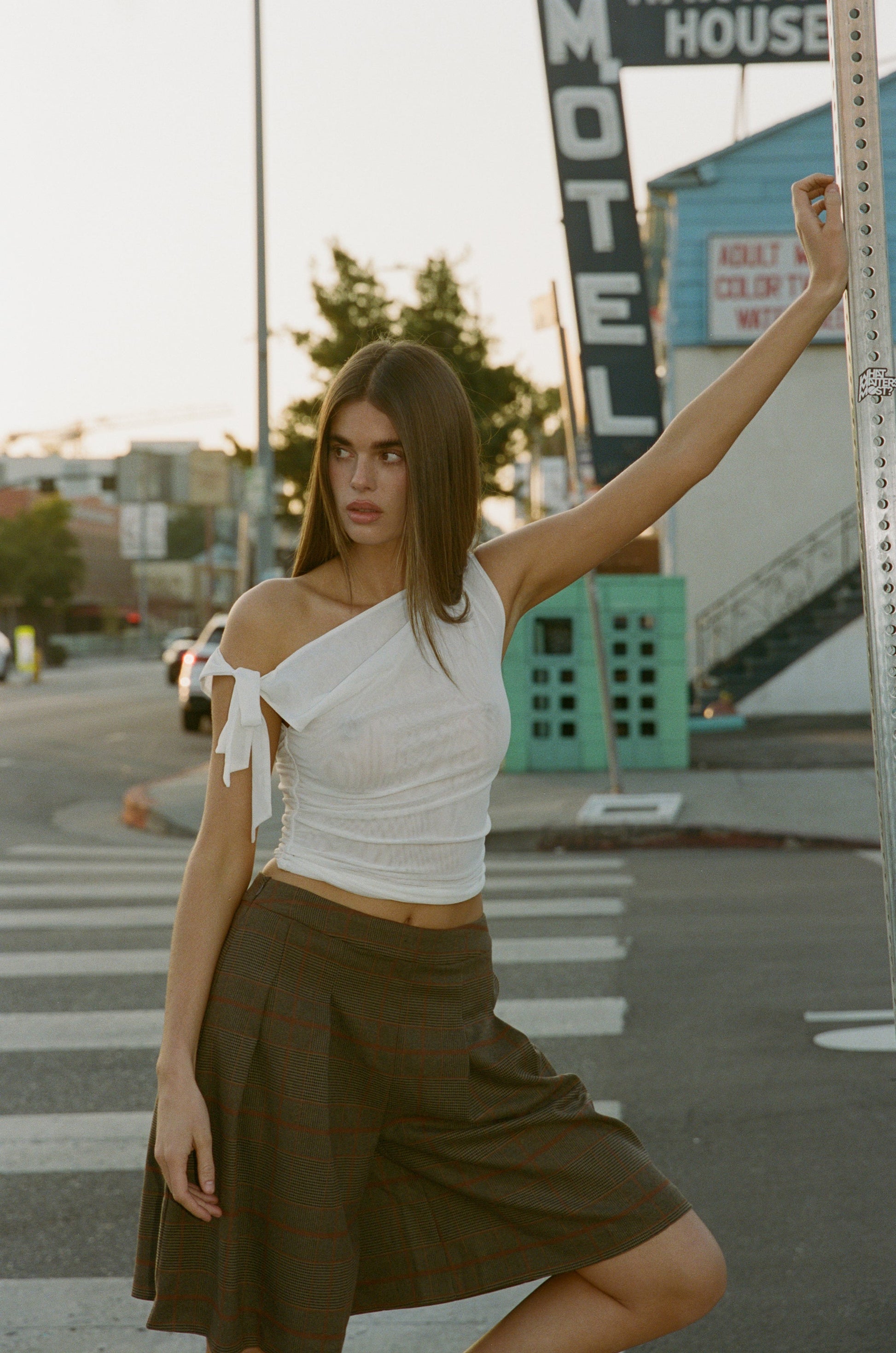 The Dalia Top is a slightly sheer top featuring a self tie at one shoulder and body ruching on both sides.